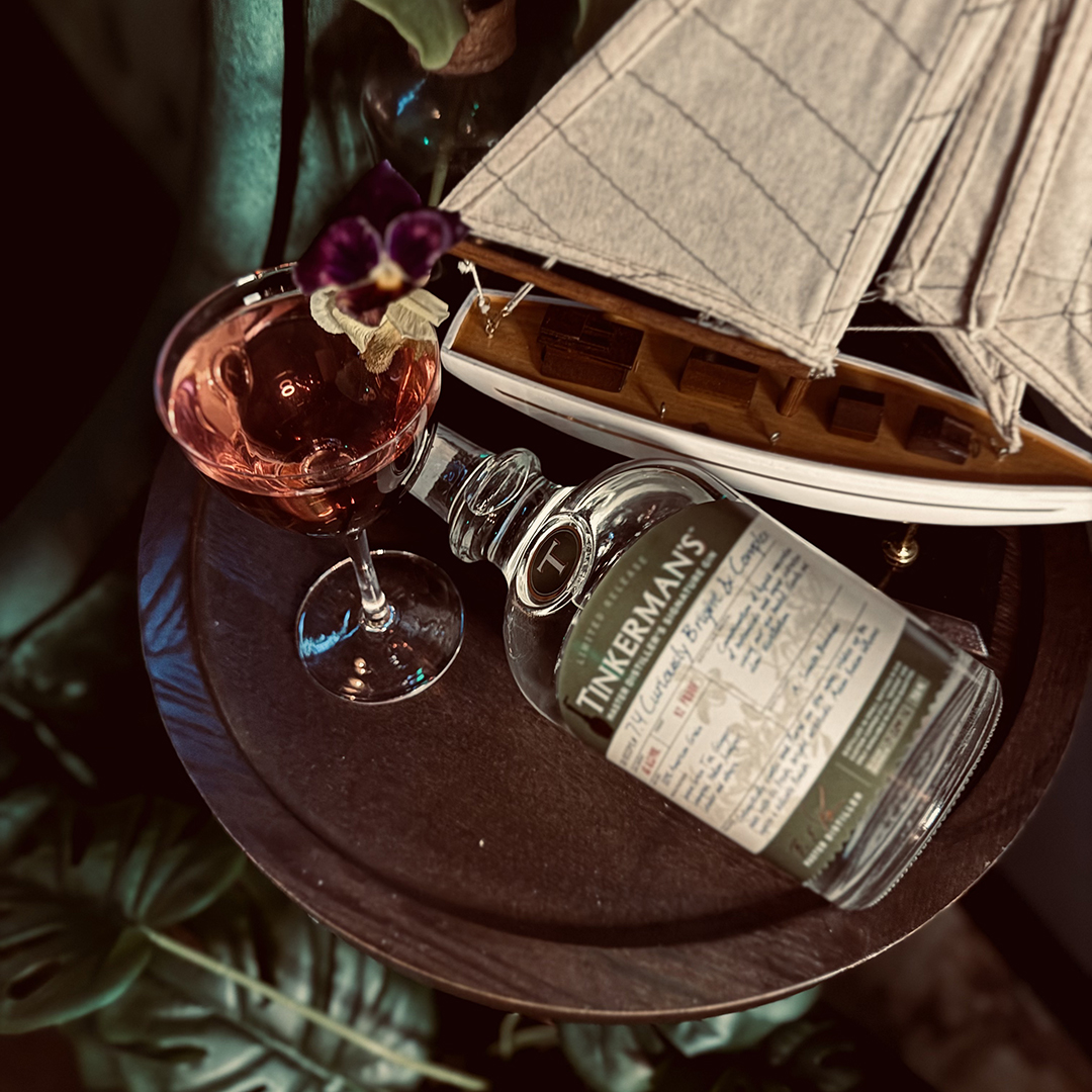 Combine ingredients in highball or collins glass and fill with ice. Skewer cucumber ribbon and add a straw.