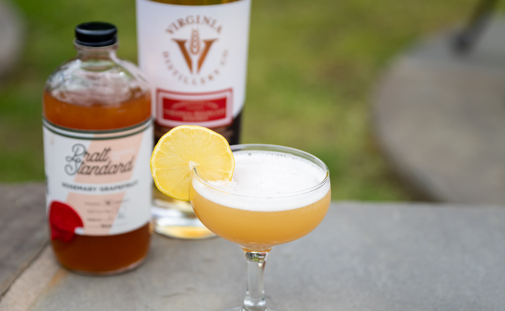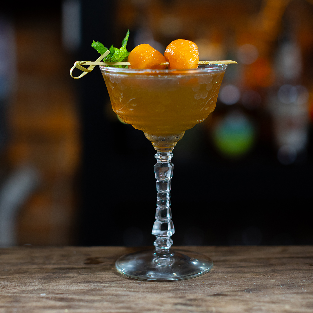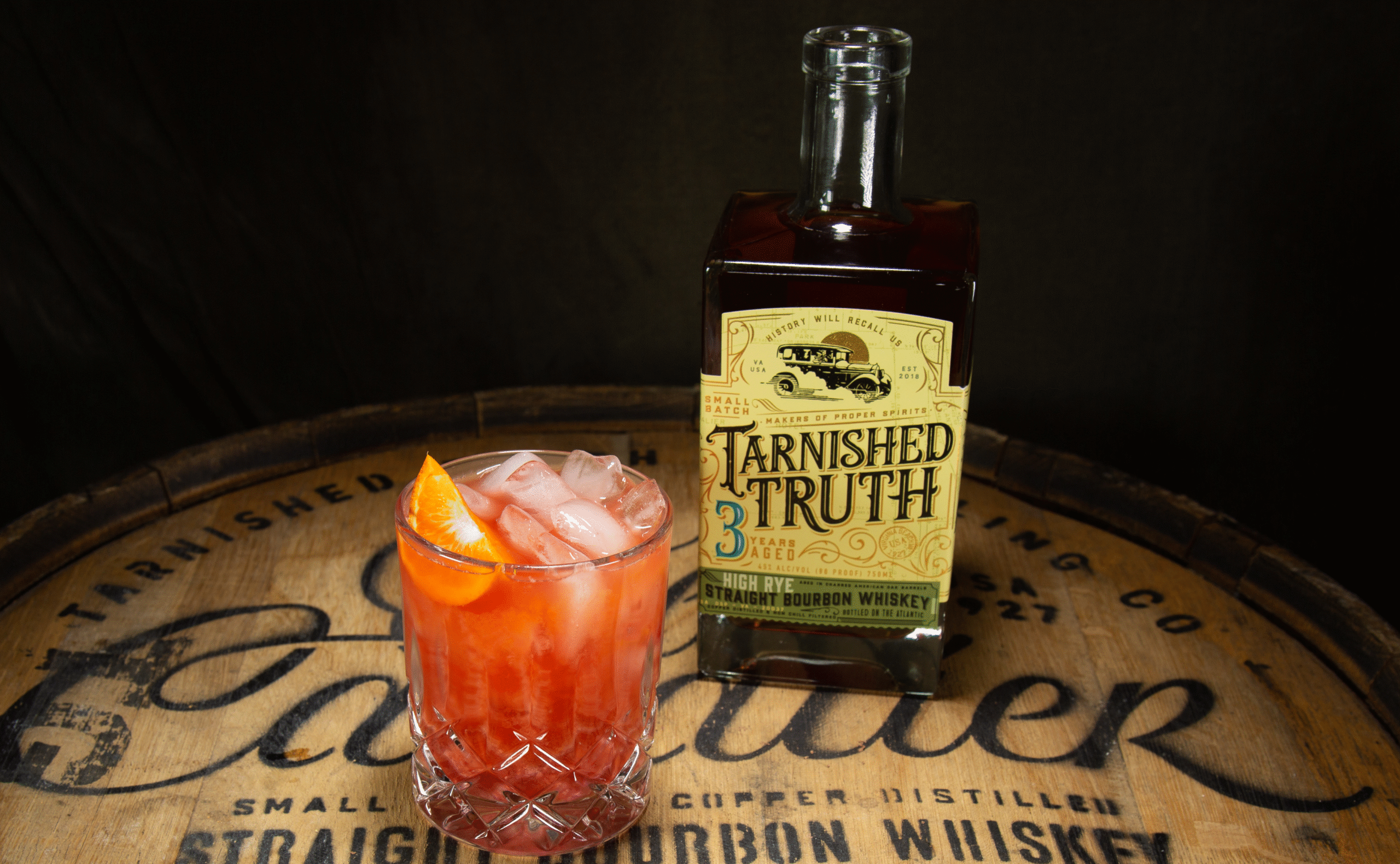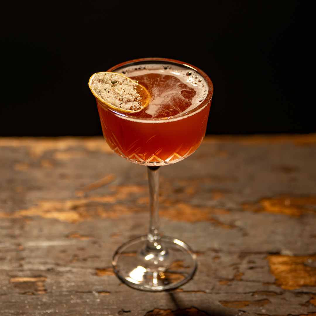 Prepare garnish by skewering one and of the orange peel, then the cherry, and finally the other end of the orange peel, ensuring the orange side is out; place in a martini glass. Shake together the ice, blood orange juice, Copper Fox Rye Whisky, Heering Cherry Liqueur, simple syrup, and soaking brandy; pour through fine strainer into prepared glass.