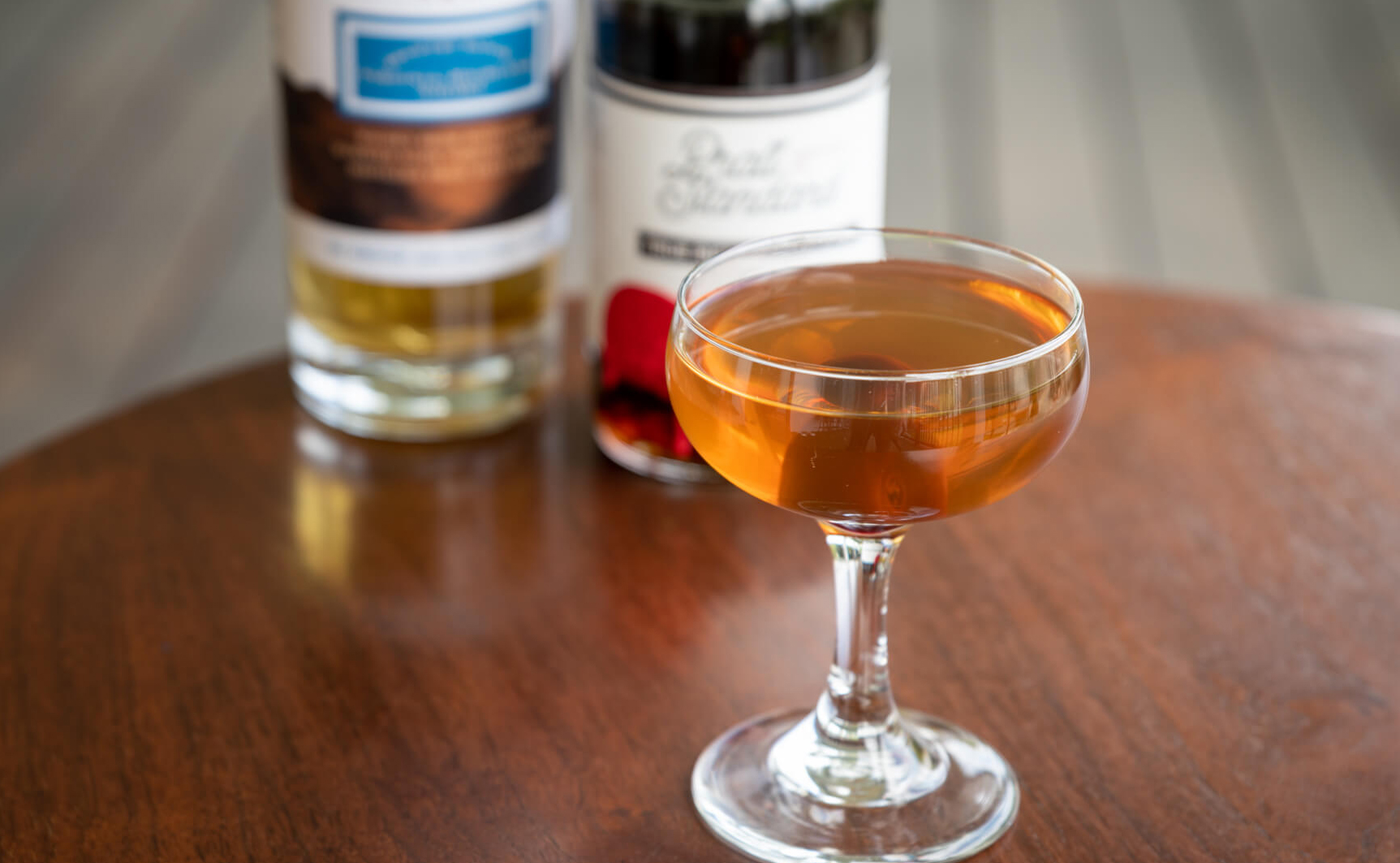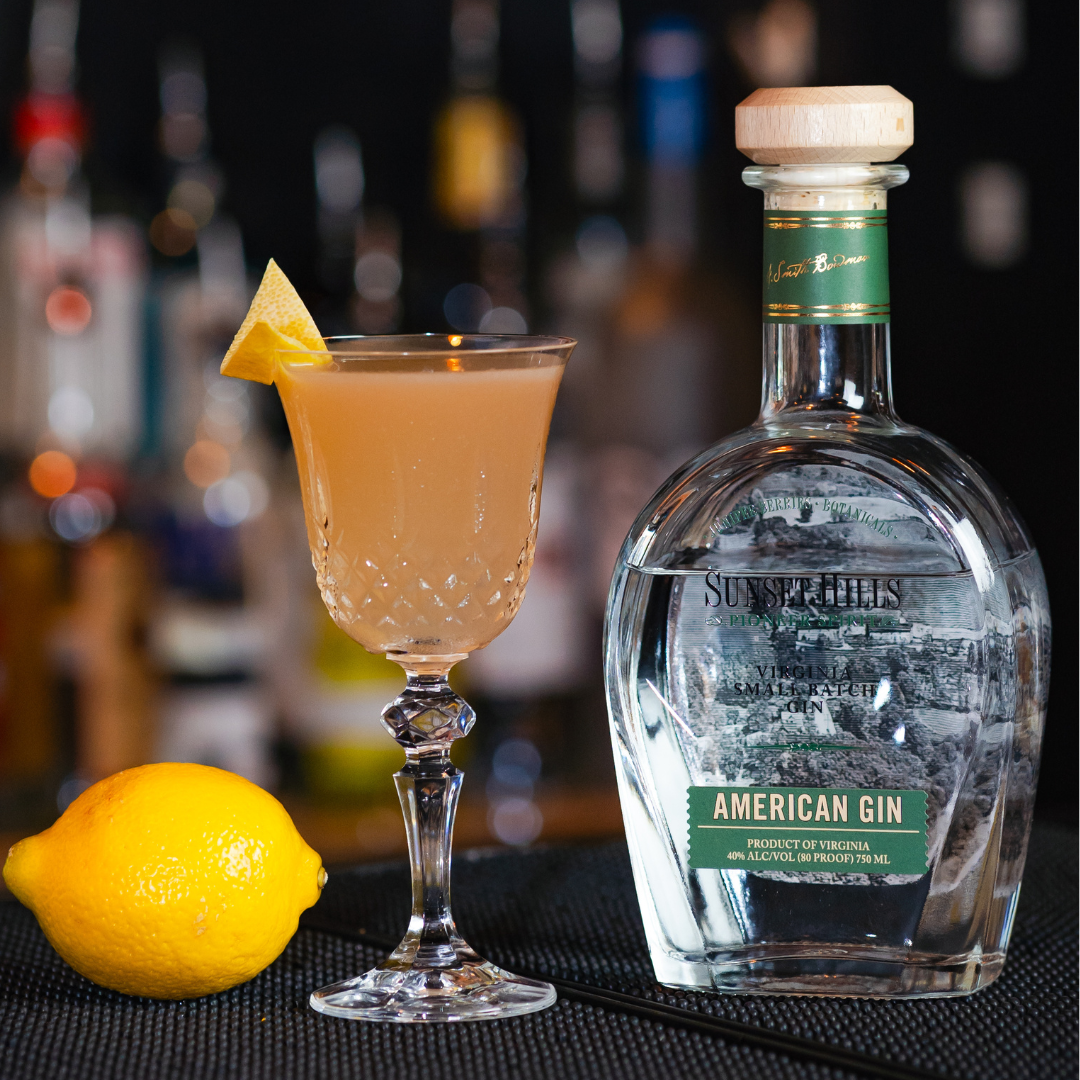 Pour Cassis liqueur into a chilled coupe glass. Combine all other ingredients in Boston shaker pint with ice, top with shaker tin, and shake vigorously until incorporated. Strain into the coupe glass and garnish with lemon twist.
