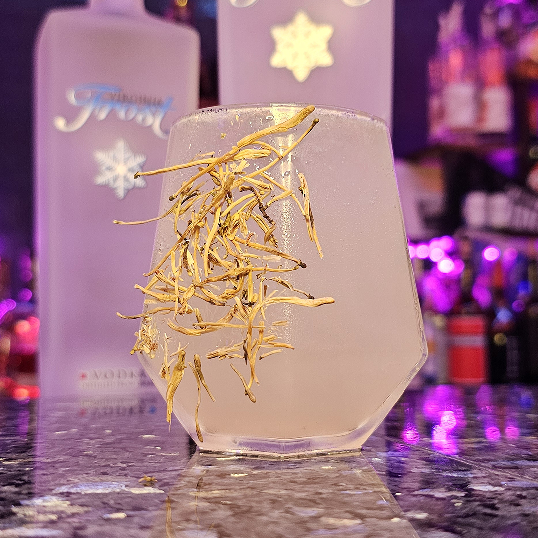 Add ingredients to a shaker. Shake well and pour over ice. Add a sprig of rosemary and cranberries for garnish.