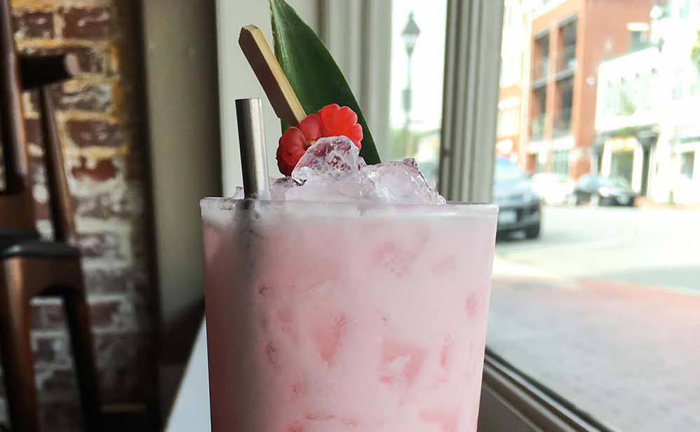 Combine in shake tin, add ice and shake well. Strain into glass filled 2/3 full with crushed ice. Top with more crushed ice, garnish with raspberries and pineapple leaf (or other tiki garnishes).